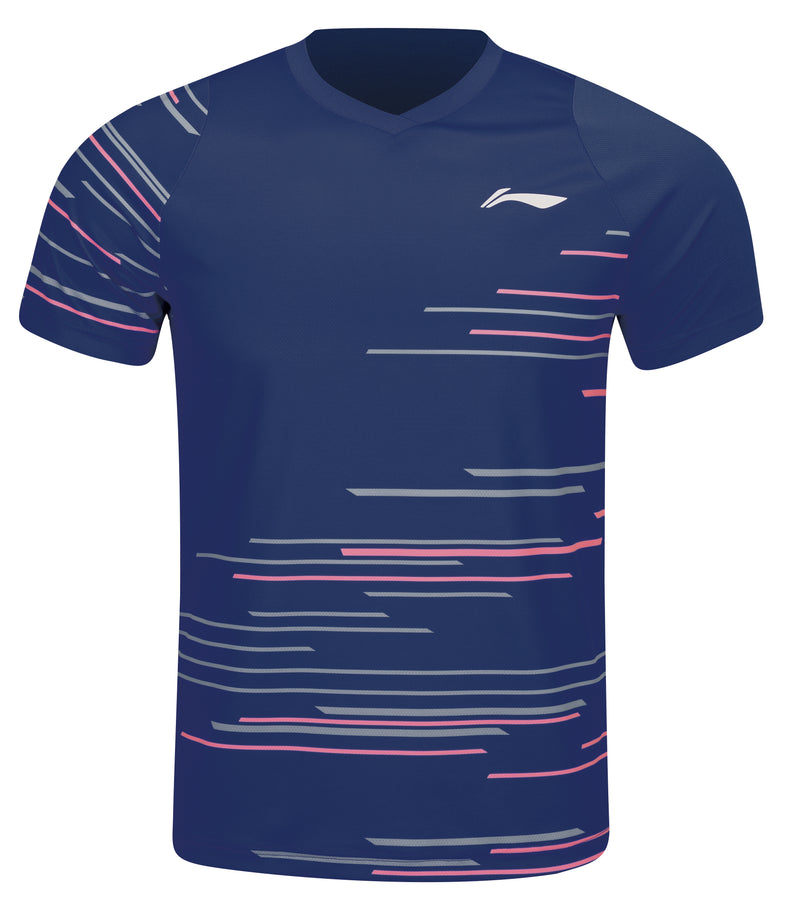 Im modischen Blau gehalten, kommt das Shirt mit den Li-Ning typischen farbigen Grafik-Highlights an Brust, Schulter und Ärmeln.